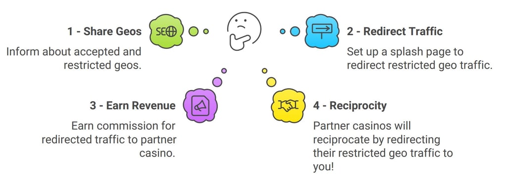 Redirect restricted geo traffic to a partner casino, receive restricted geo traffic from that partner casino, and earn reciprocal commissions, maximizing revenue from restricted players.
